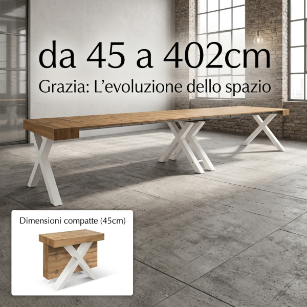 Con le sue dimensioni chiuse di soli 45 cm di lunghezza, Grazia si inserisce con naturalezza anche negli ingressi, nei corridoi o nei soggiorni più contenuti, occupando lo spazio di una semplice consolle decorativa. Ma quando gli ospiti arrivano, rivela la sua vera natura: grazie alle sue sette allunghe centrali, si estende fino a 402 cm, accogliendo comodamente fino a 16 persone attorno a un’unica tavola. Il piano in nobilitato melaminico color rovere rustico, dallo spessore generoso e dalla venatura calda e avvolgente, conferisce a Grazia un carattere deciso e autentico.