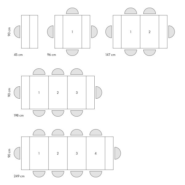 Misure aperto: 249 x 90 x 76 cm (con quattro allunga)