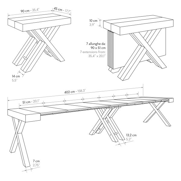 consolle allungabile Luisa da 45 a 402 con gambe rovere a X